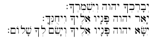 Yevarechecha AdonaiVe'yishmerecha. Ya'er Adonai panayv eylecha vi'chuneka. Yissa Adonai panayv eylecha ve'yaseym lecha shalom.